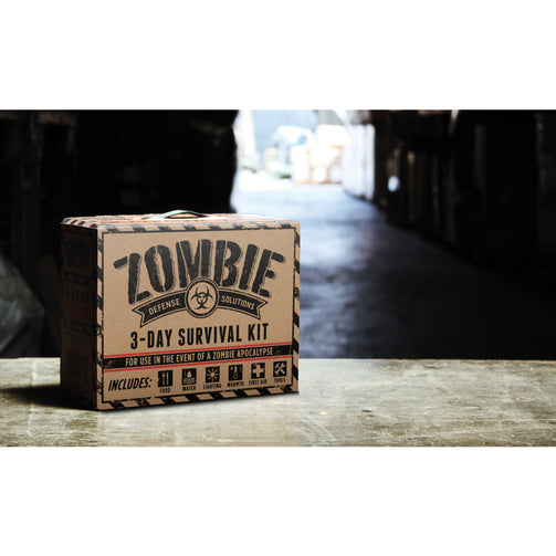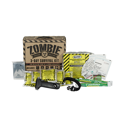 Prepare now with our Zombie Defense Solutions: 3-Day Survival Kit. Our kit includes food, water, light, warmth, tools, and a basic first aid kit - all the essential items needed to survive for 3 days! When the Zombie Apocalypse comes or the next big disaster hits, feel safe knowing that you have the essential items to survive!